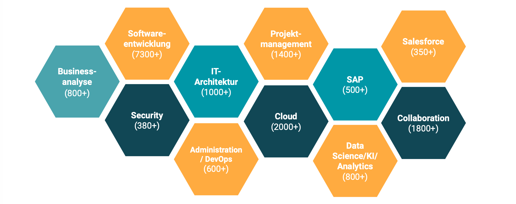 Das gemeinsame Kompetenzportfolio ist beeindruckend vielseitig. In der Softwareentwicklung stehen über 7300 Spezialisten zur Verfügung, die von klassischen Individualentwicklungen bis hin zu modernen Cloud Architekturen alles abdecken. Die Bereiche Data Science, KI und Analytics werden durch etwa 800 Expertinnen und Experten vertreten, die datengetriebene Geschäftsmodelle und intelligente Anwendungen ermöglichen. Dazu kommen rund 2000 Cloud Spezialisten, 1000 IT Architekten, 380 Security Fachkräfte und etwa 1400 Projektmanager, die für strukturiertes, effizientes und sicheres Arbeiten sorgen. Ergänzt wird dieses Spektrum durch erfahrene Berater in Business Analyse, Quality Management, SAP, UX, Mobile Development und weiteren Technologien.